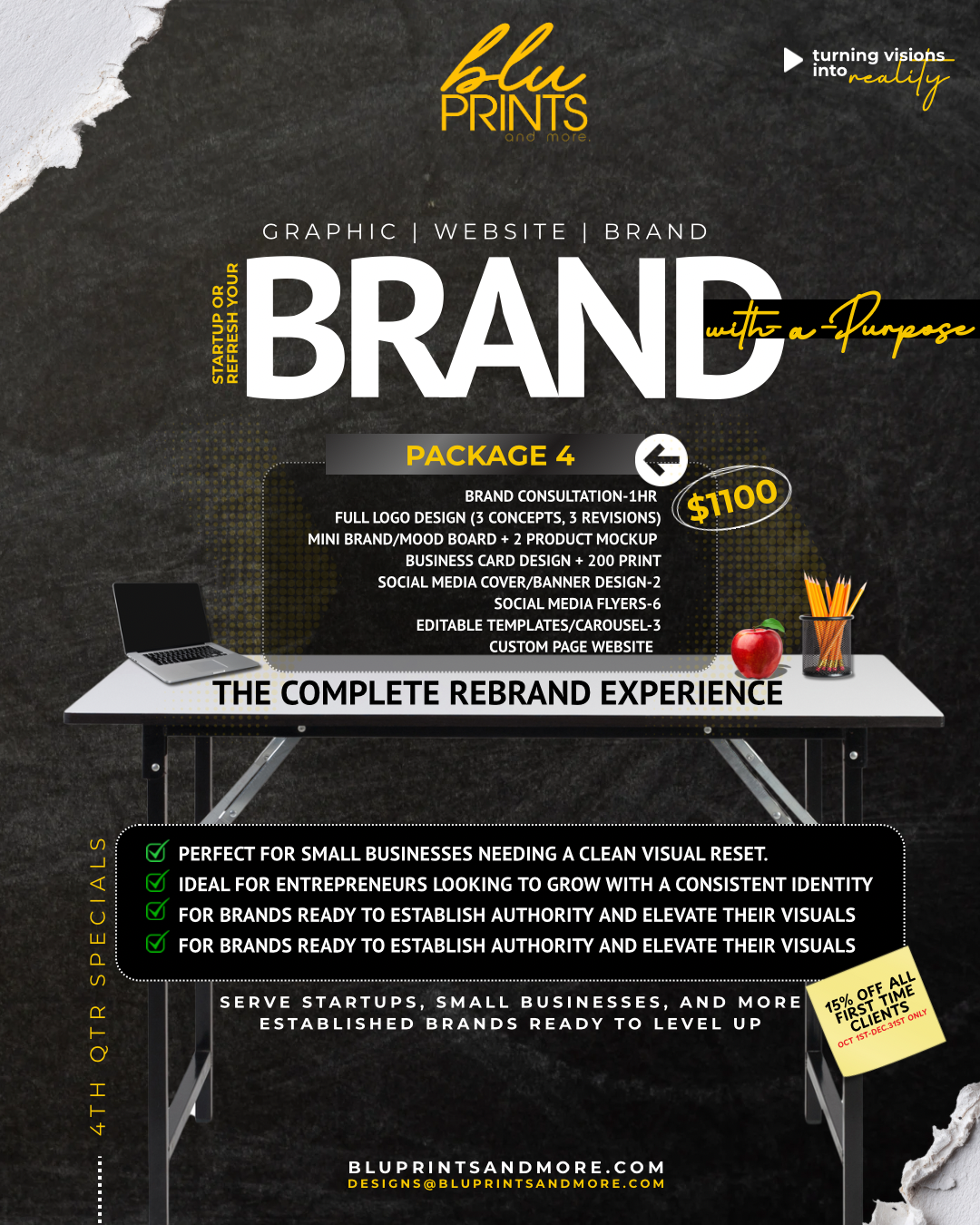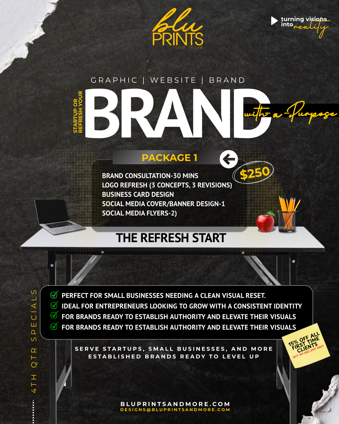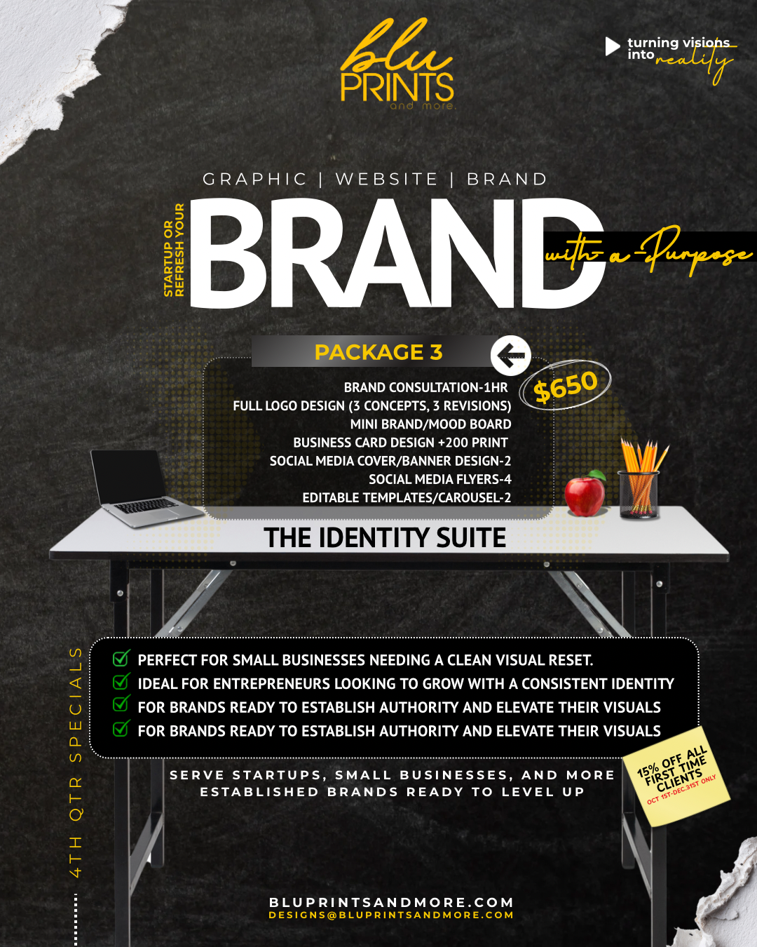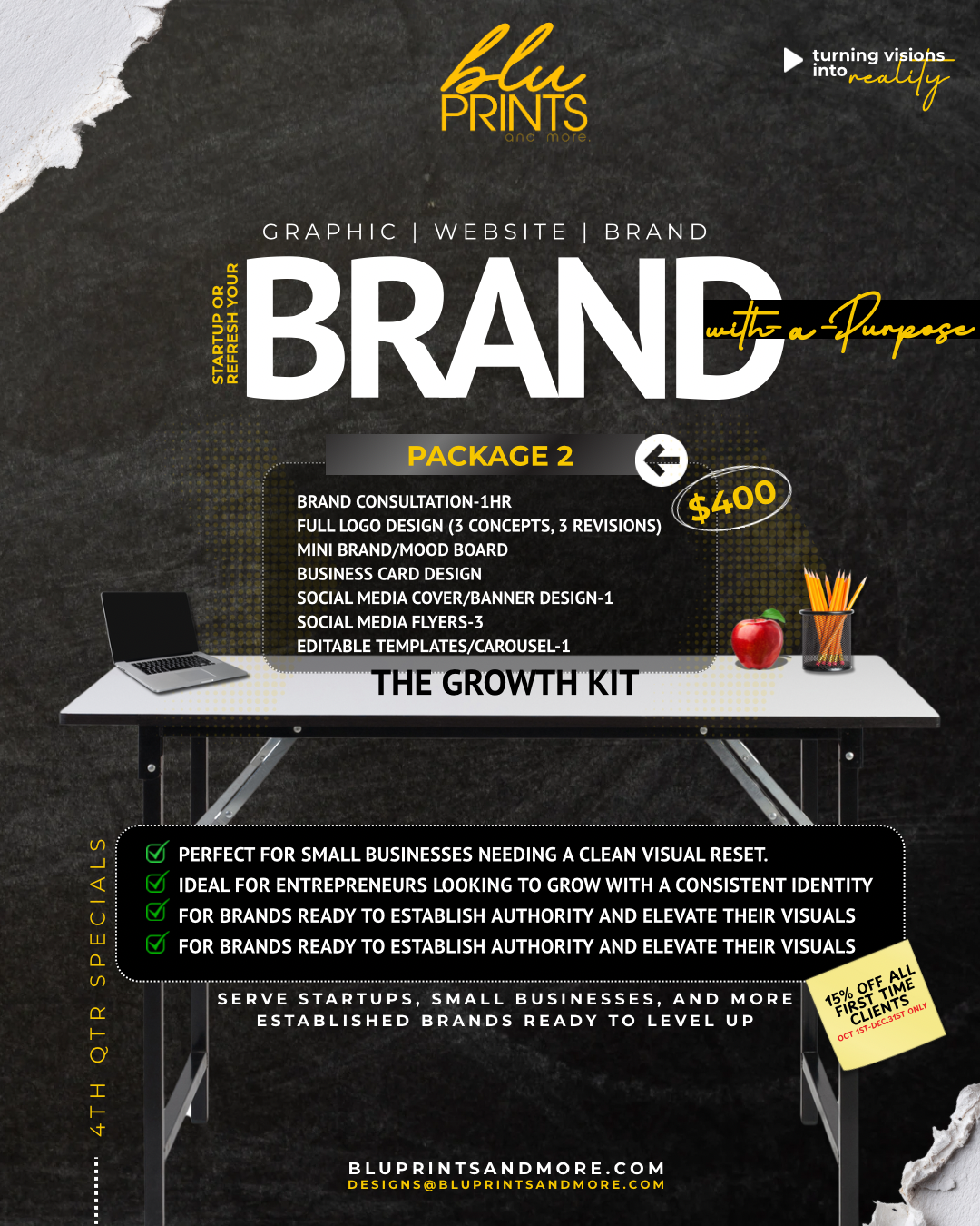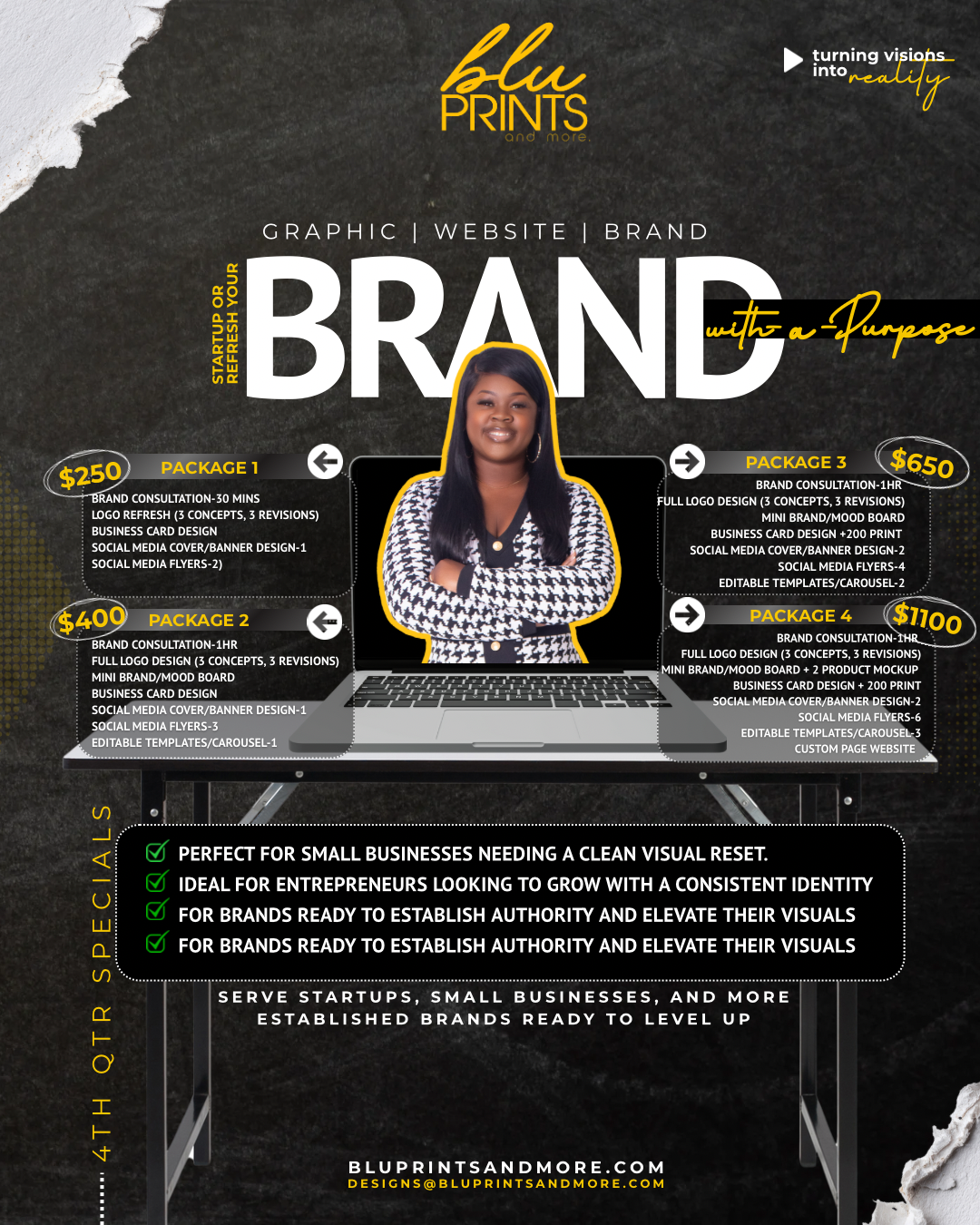 Brand with a Purpose from $250.00 Logo Design $90.00 Flyer Design $50.00 Banner Design from $70.00 Business Card Design $50.00 Columns Design $70.00 Brochure Design $85.00 Door Hanger Design $65.00 Back Drop Design from $70.00 Menu Design $75.00 IG Carousel Template $50.00 Tshirt Design $40.00 Monthly Retainer Program from $250.00 Brand+ Website Design Packages from $1,500.00 Landing Page Development from $650.00 Revamp Website from $650.00 Website Development from $900.00 Book consultation